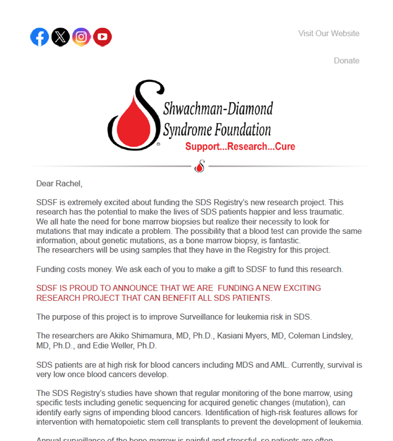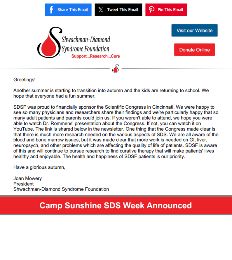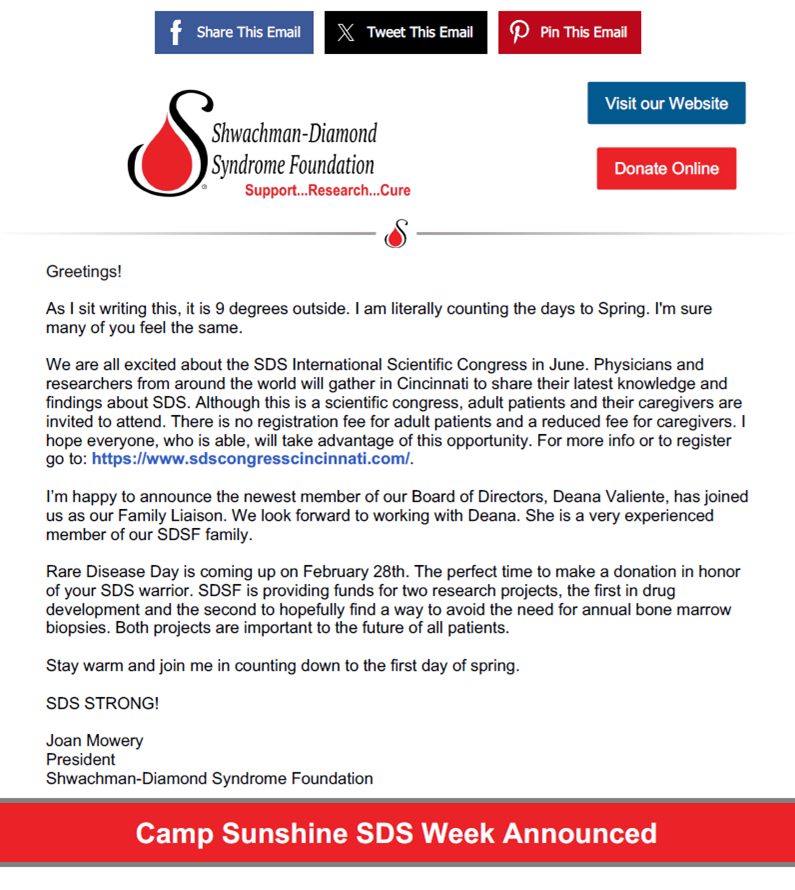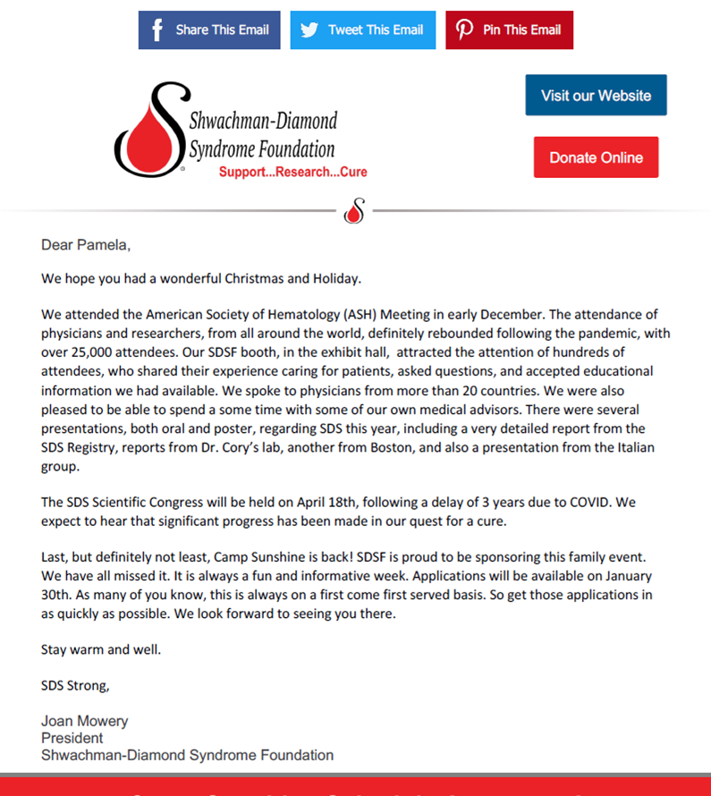 Have an article, update or fundraising activity you would like to share in a future newsletter? Email your story/information to christiandelre@shwachman-diamond.org.